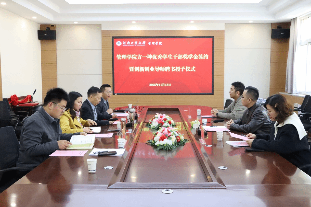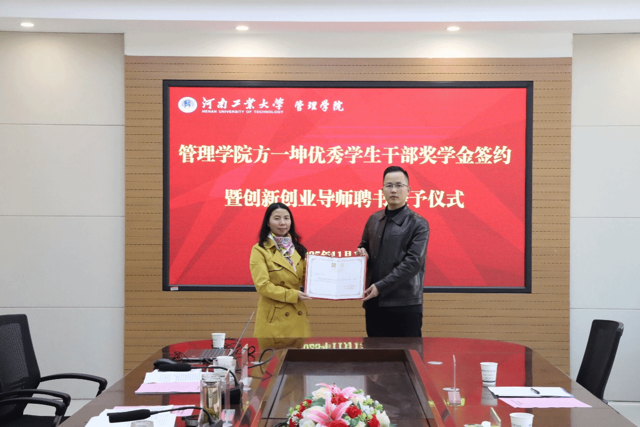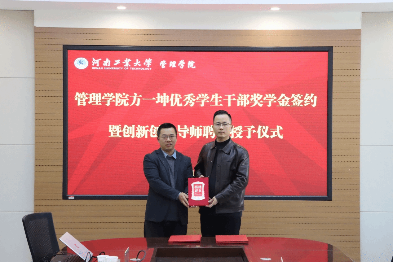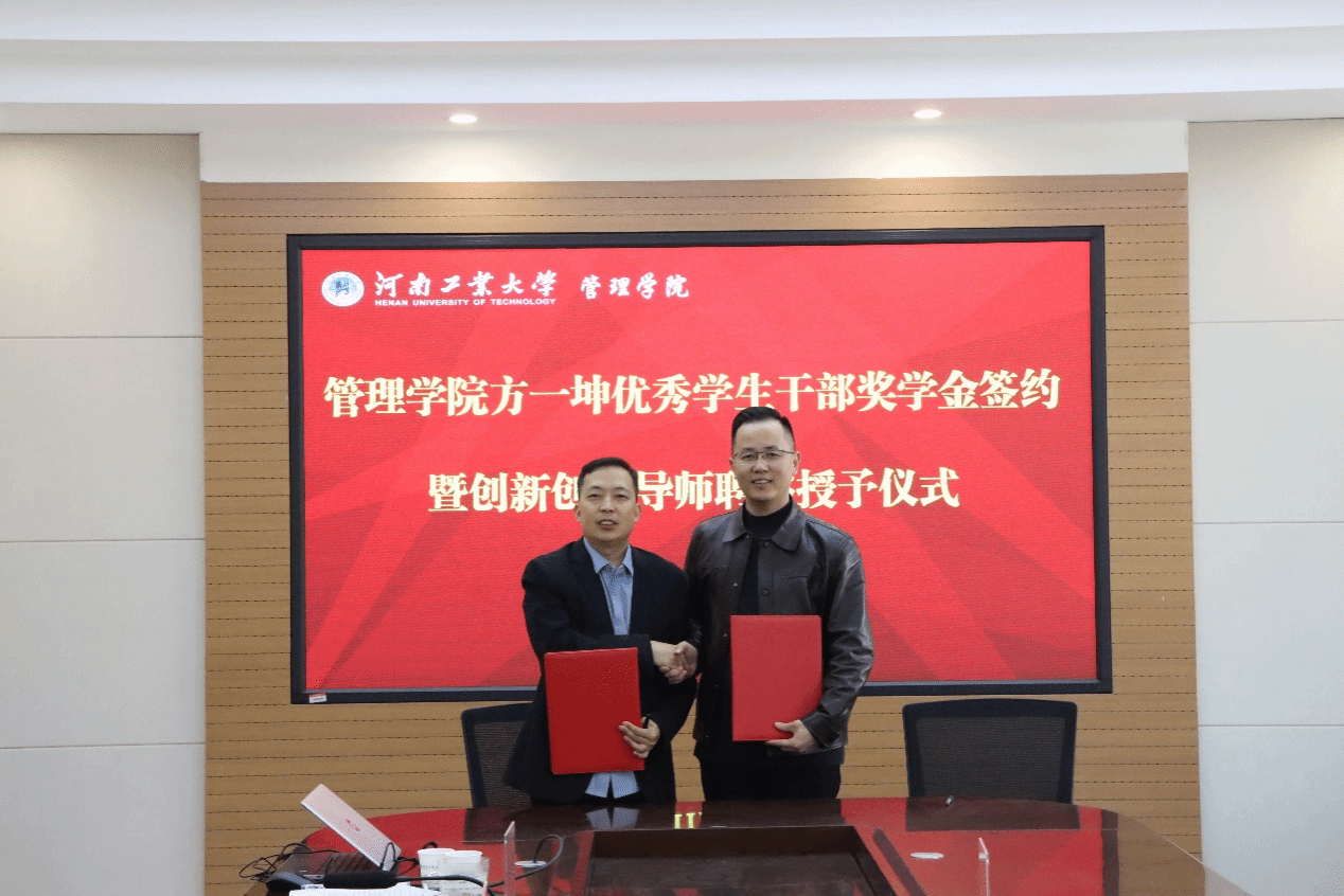 “方一坤优秀学生干部奖学金”签约暨创新创业导师聘任仪式在博识楼3558会议室举行。方一坤集团总裁宋东方、人力资源部行政经理郑雪、新媒体运营部经理郭子恺,亚洲成人