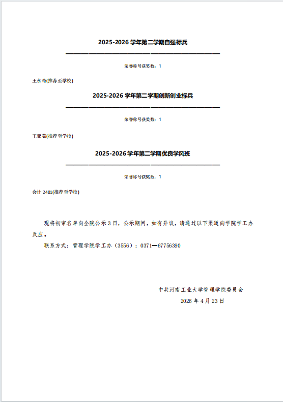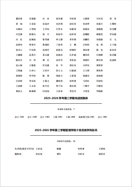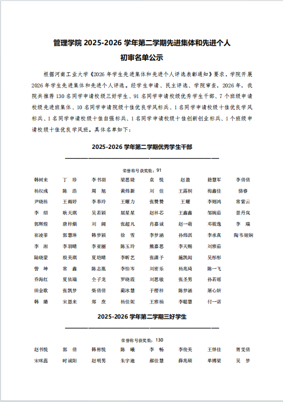 亚洲成人 2025-2026学年第二学期先进集体和先进个人初审名单公示