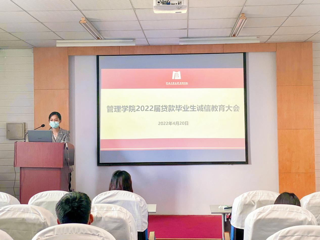 采用线上线下相结合的形式在3433报告厅召开2022届贷款毕业生政策宣讲暨诚信教育大会。学院学工办主任吴若旻、资助工作负责人郑媛媛、学院资助助理及贷款毕业生参加会议。