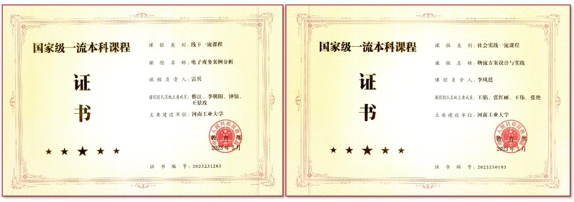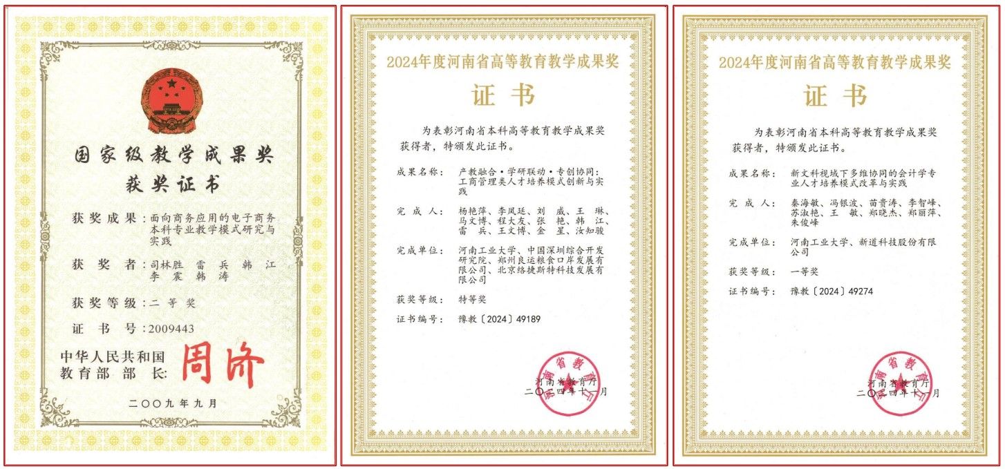电子商务系、物流管理系、会计系为河南省优秀基层教学组织,电子商务为河南省教学团队,电子商务与现代物流管理为河南省本科高校黄大年式教师团队,粮食现代物流管理、大数据与管理决策、数字经济与技术创新管理为河南省高校哲学社会科学创新团队。