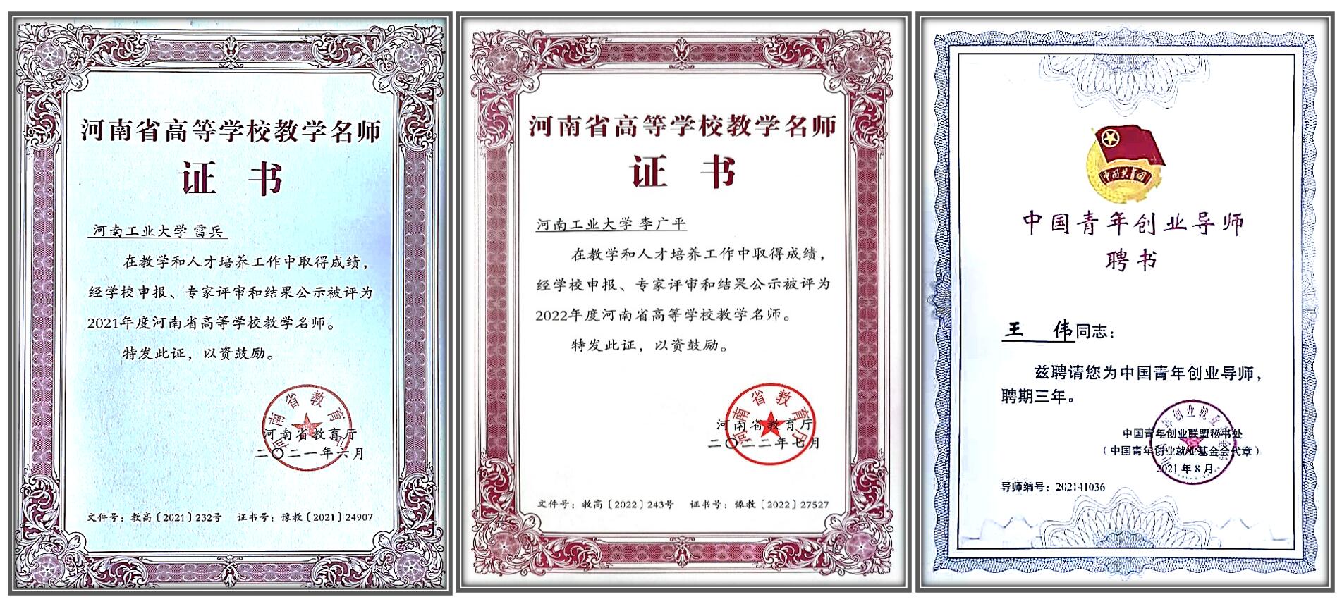 其中,教育部专业教学指导委员会委员1人、河南省专业教学指导委员会委员4人,河南省学术技术带头人、河南省优秀专家2人,河南省教育厅学术技术带头人7人,中国青年创业导师1人,河南省高等学校青年骨干教师13人,河南省高校科技创新人才(人文社科类)12人,河南省优秀教师、教学名师、教学标兵等称号13人,河南省教学(教师、导师)和科研创新团队6个。